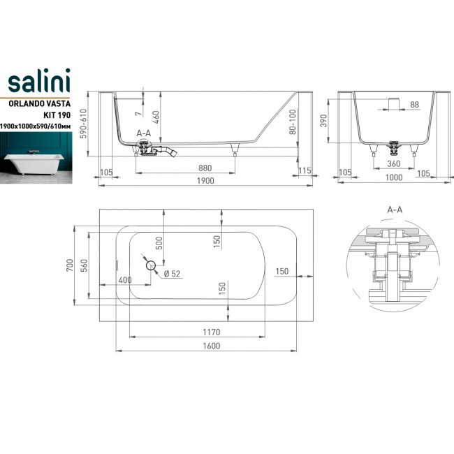 Ванна Salini Orlanda Kit Plus 190x100 102124M S-Stone купить с доставкой. 100% Оригинал. Гарантия!