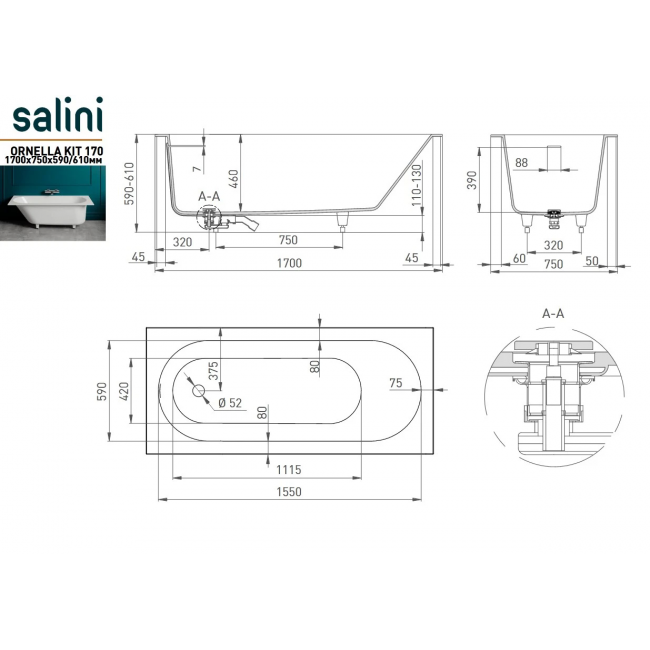 Ванна Salini Ornella Kit 170x75 102411M S-Sense купить с доставкой. 100% Оригинал. Гарантия!