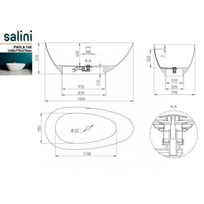 Ванна Salini Paola 160x77 101511G S-Sense купить с доставкой. 100% Оригинал. Гарантия!