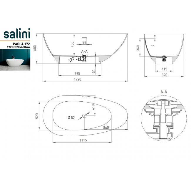 Ванна Salini Paola In 172x82 101612SM S-Stone купить с доставкой. 100% Оригинал. Гарантия!