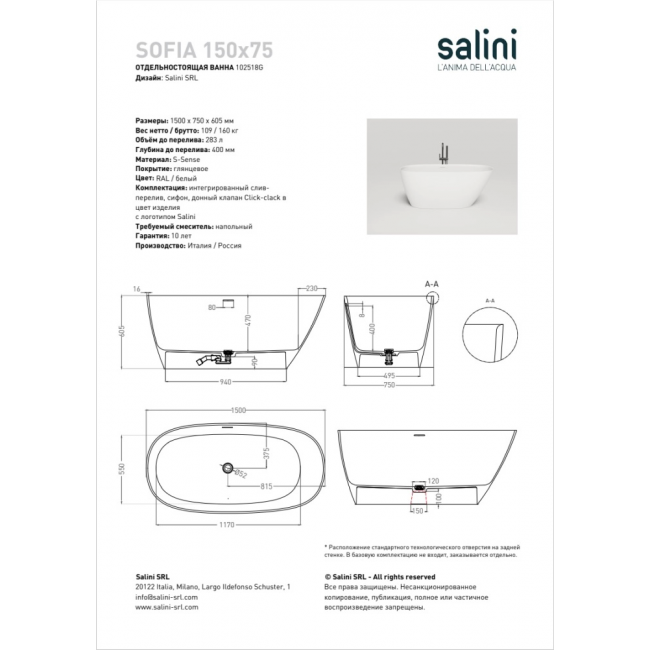 Ванна Salini Sofia 150x75 102528M купить с доставкой. 100% Оригинал. Гарантия!