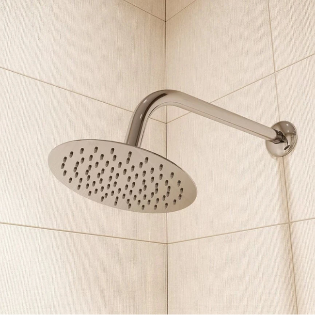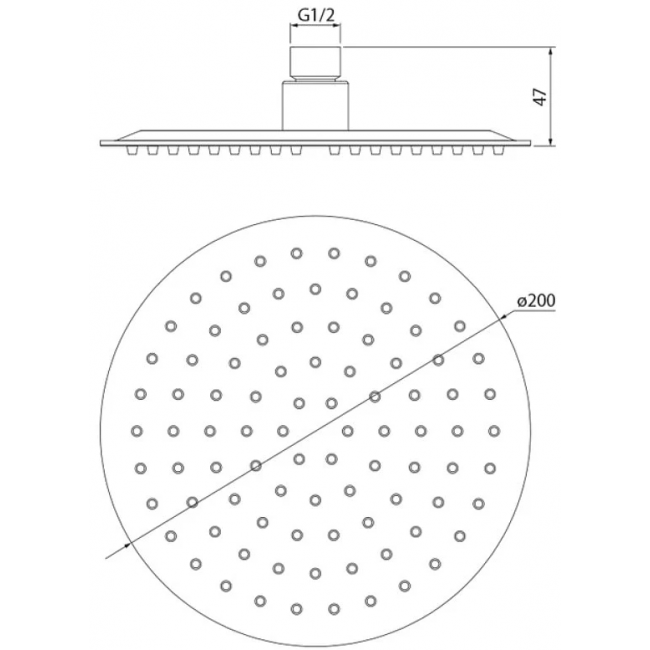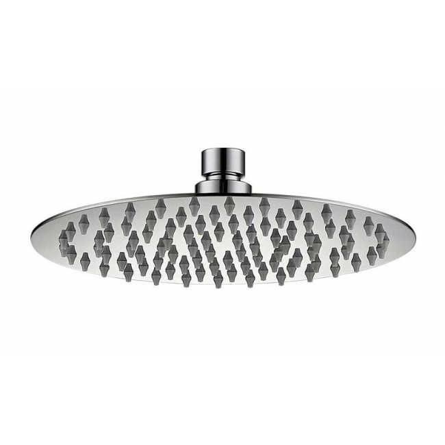 Душевая насадка верхняя, круглая, материал нержавеющая сталь (тонкая), диаметр 200 мм, серая лицевая пластина, темно-серые форсунки.