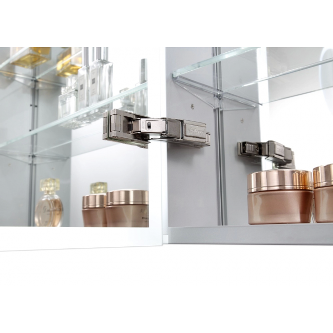 Петли BLUM с доводчиком и углом открывания на 95 градусов обеспечивают плавное и бесшумное открытие дверей, что делает использование шкафа комфортным на протяжении всего срока эксплуатации. Зеркальный шкаф для ванной выполнен из влагостойких и прочных материалов, что гарантирует его долговечность и устойчивость к воздействию влаги в ванной комнате.