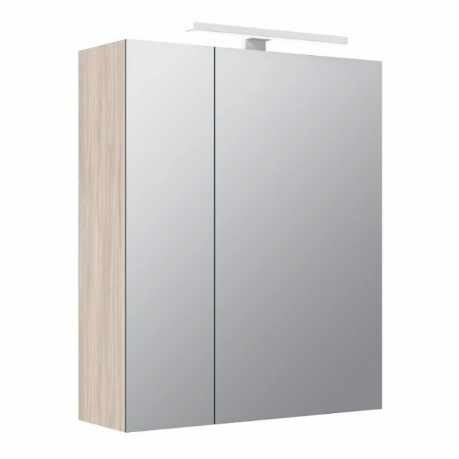 Шкаф-зеркало для ванной комнаты. Материал: ЛДСП 16 мм, цвет "ясень шимо". Размеры: 166х500х600 мм (ДхШхВ). Две распашные зеркальные дверцы. Стеклянная полка крепится на фиксаторы. Выносной LED-светильник, кнопка включения расположена на фронтальной части, рядом со встроенной розеткой. Петли с доводчиками. Упаковка: картон, пленка, пенопластовые уголки.