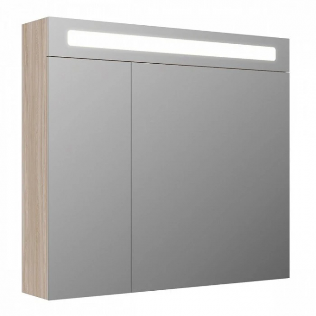 Шкаф-зеркало для ванной комнаты. Материал: влагостойкий ЛДСП. Размеры: 800х166х700 мм (ШхГхВ). Две распашные дверцы. Стеклянная полка крепится на фиксаторы. Встроенный LED-светильник, кнопка включения расположена на фронтальной части, рядом со встроенной розеткой. Петли с доводчиками. Упаковка: картон, пленка, пенопластовые уголки.