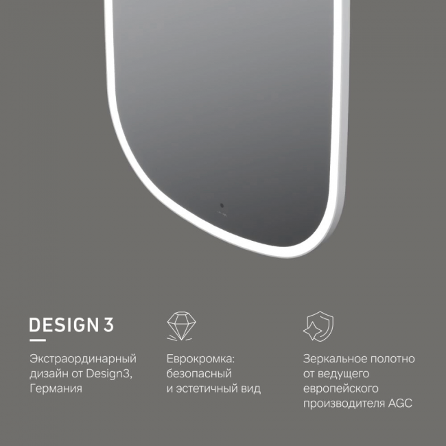 Зеркало изготовлено из зеркального полотна от ведущего европейского производителя зеркал AGC. Изделие имеет высокую степень защиты от попадания капель воды брызг. Край зеркального полотна обработан еврокромкой что обеспечивает надежную защиту от случайных порезов при контакте с изделием.