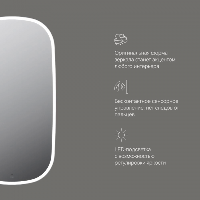 В качестве элемента LED-подсветки используется светодиодная лента которая создает мягкое и равномерное свечение по периметру всего зеркала. Управление подсветкой осуществляется при помощи бесконтактного сенсора. Сенсор нового поколения позволяет управлять включением/выключением и яркостью LED-подсветки без касания зеркального полотна. Зеркало дольше остается чистым. Зеркало поставляется в комплекте с настенным крепежом и инструкцией.